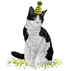 - Black and white European Shorthair with party hat (MH birthday 2025) ✘